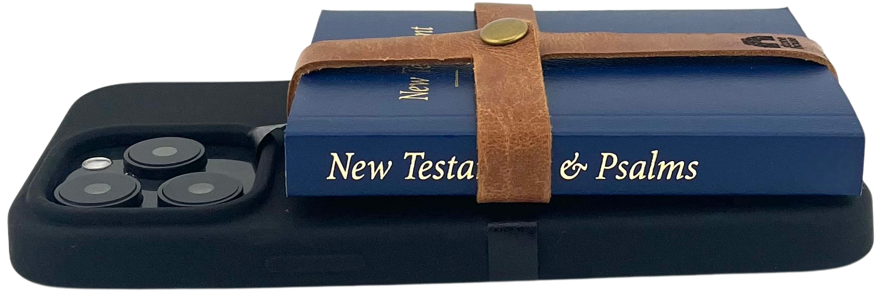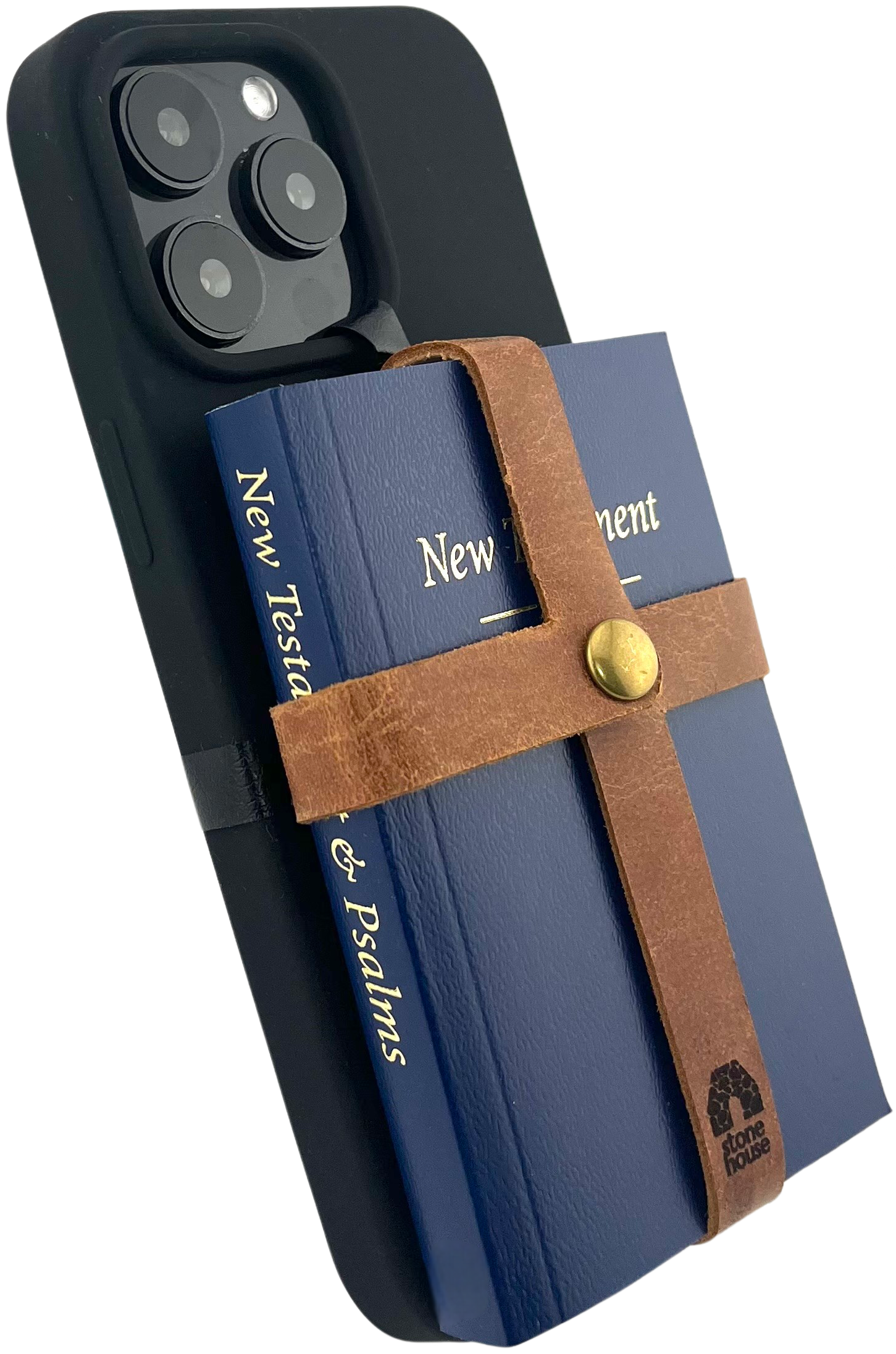This universal bible phone carrier can be attached to almost any phone case. Bible, leather straps, and adhesive attachment included.